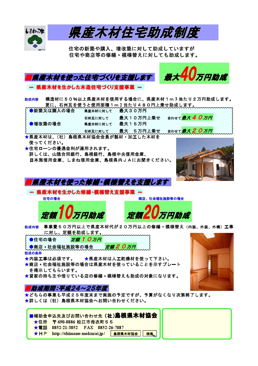 条件等詳しくは添付のパンフレットをご覧に成るか、下記連絡先「島根県木材協会」までお問い合わせ下さい。
