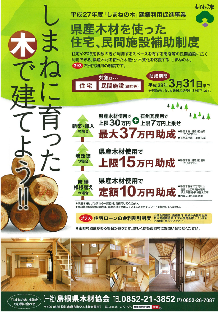 弊社も認証機関として参加しております「しまねの木 認証材」や「石州瓦」を使うと補助が得られる島根県の制度です。