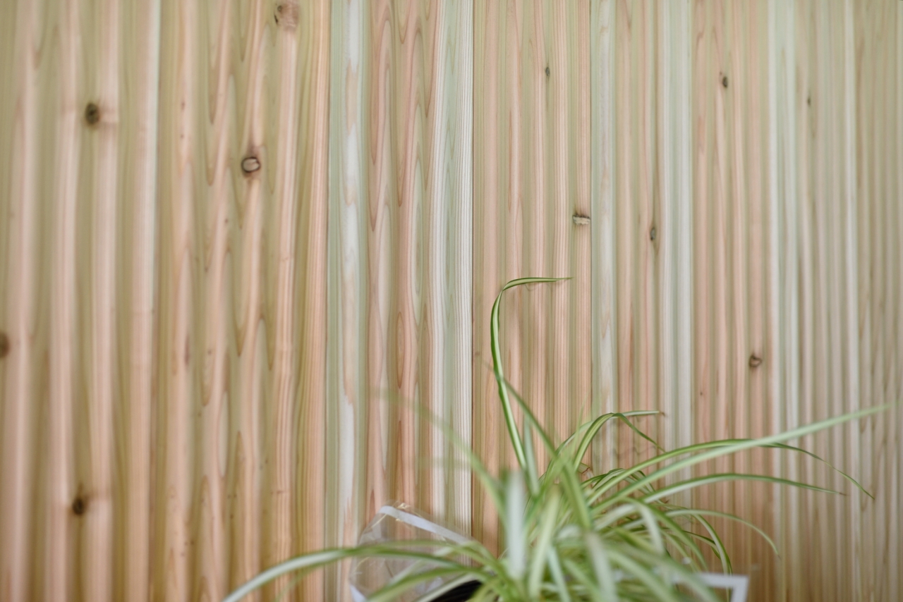 杉の上小無地材(節が少ない)にスリットを複数刻んだ「スリットウォール」と言う商品です。