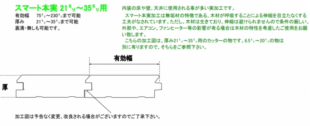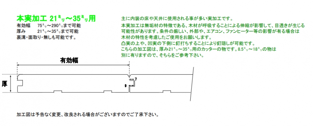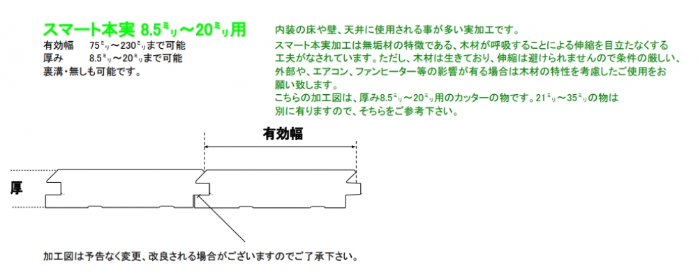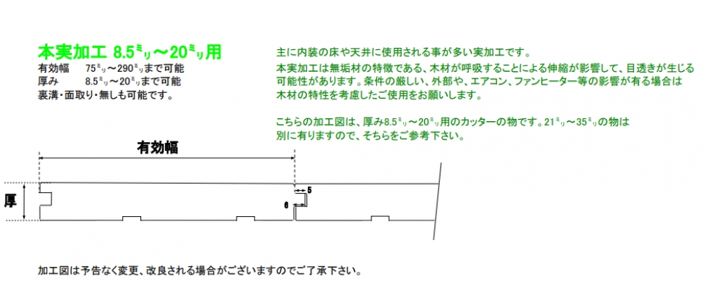 スタンダードな本実加工です。主に床に使用されることが多く、実(さね)は突き付けに成ります。壁や天井に使用される事も有りますが、雨ざらしの外部の壁には伸縮により施工後に目透き等の問題が発生する可能性が有るためオススメ出来ません。