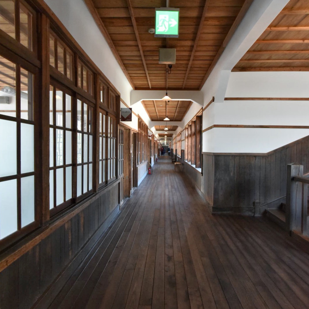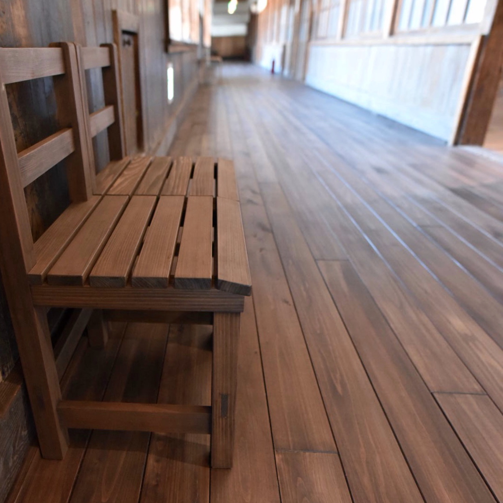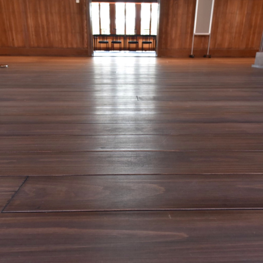 歴史的な文化財の既存のフロアや壁板とのマッチングをするため桧フロアに着色をして風合いを似せております。施工サイズ3900x140x15等